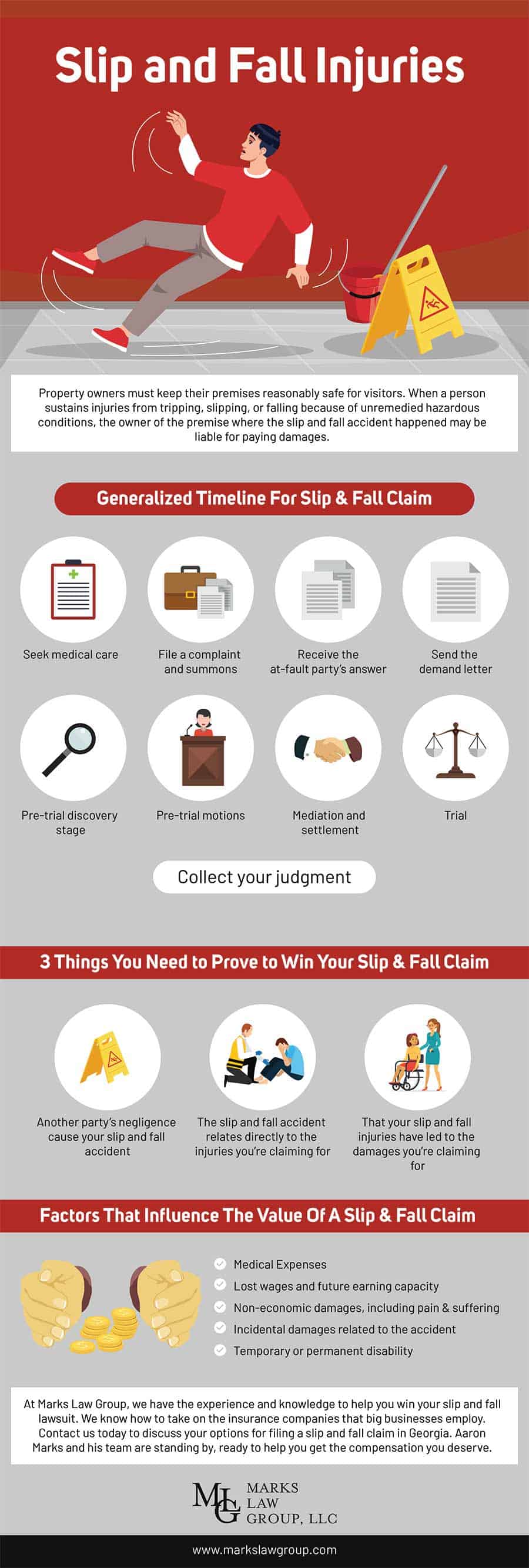 According to the california business journal , the average amount awarded in slip-and-fall claims ranges between $15,000 and $50,000, depending on the factors of the lawsuit. What you receive in damages depends on your injuries and their severity. For more severe injuries, naturally, the settlement amount is higher. A lawyer for fall and slip lawsuits normally requests coverage for financial losses attributed to the mishap. These include medical expenses, including treatments and prescriptions, and the money you have not earned because of your injuries. Damages for pain and suffering are harder to figure, out but normally are proportionate to the extent of your injuries or their permanency.